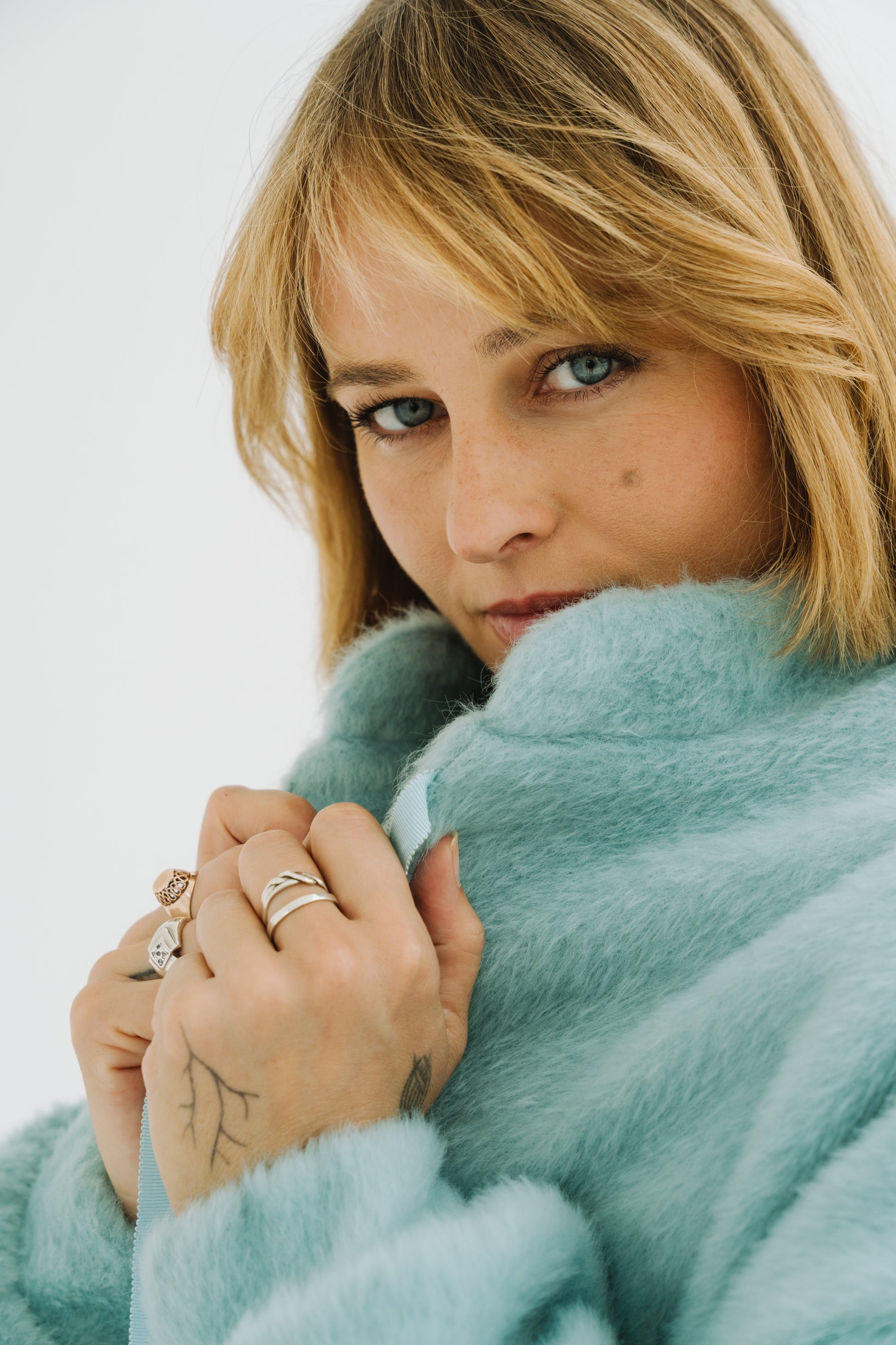 Bomber abalonado na cintura, em malha com pelo azul bebé, com forro amarelo-limão.