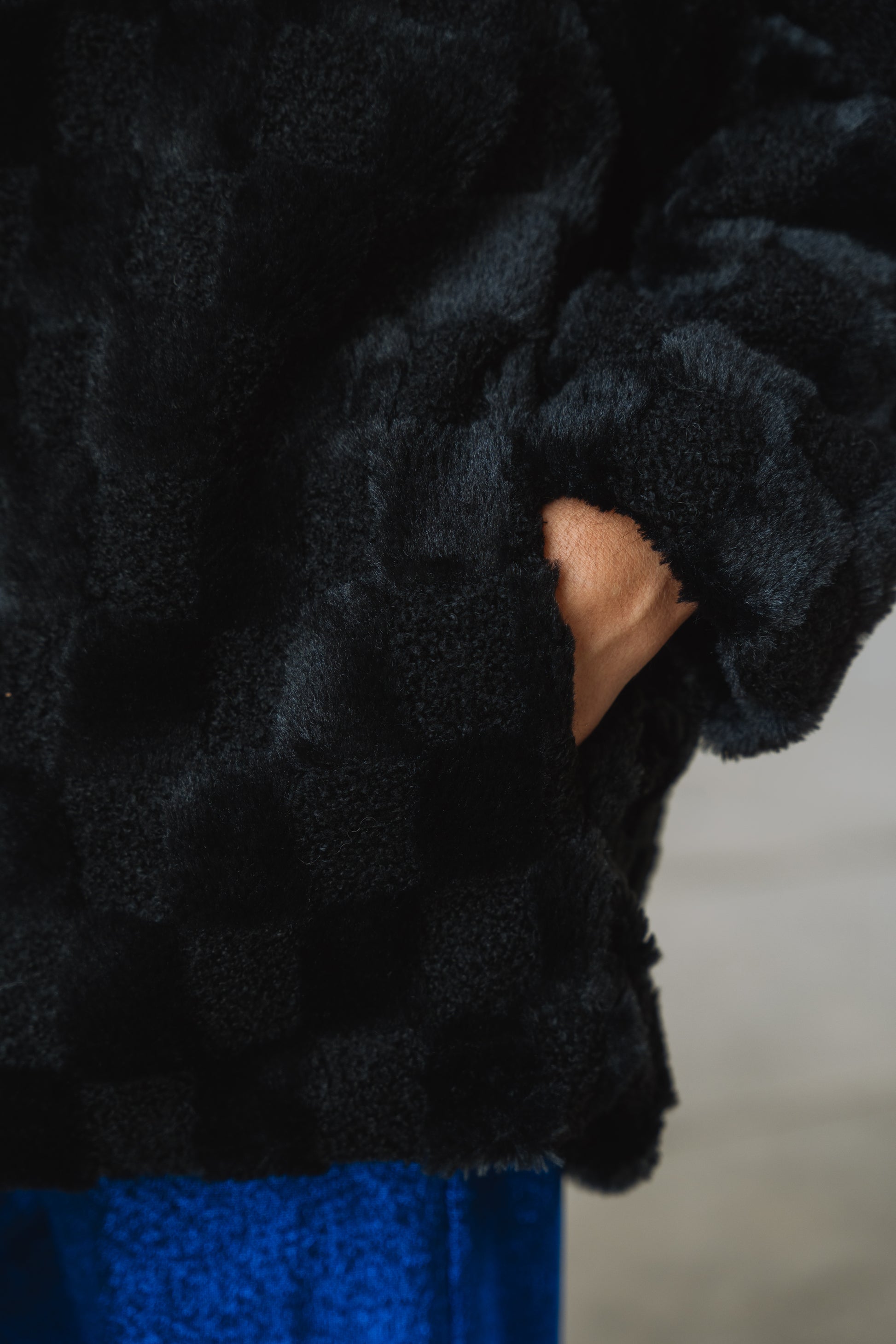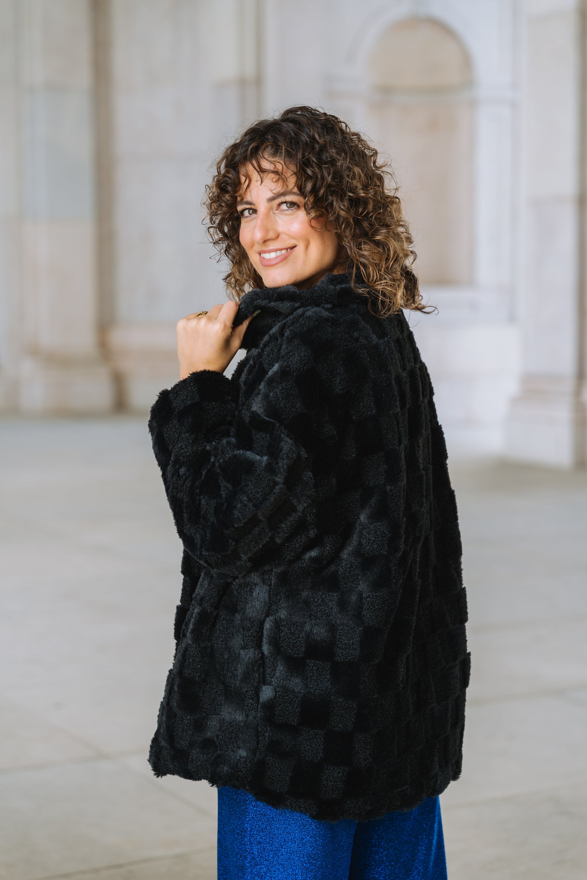 Casaco em pelo preto, com efeito quadriculado, com contraste entre baixo-relevo (mais texturado) e alto-relevo (mais liso).