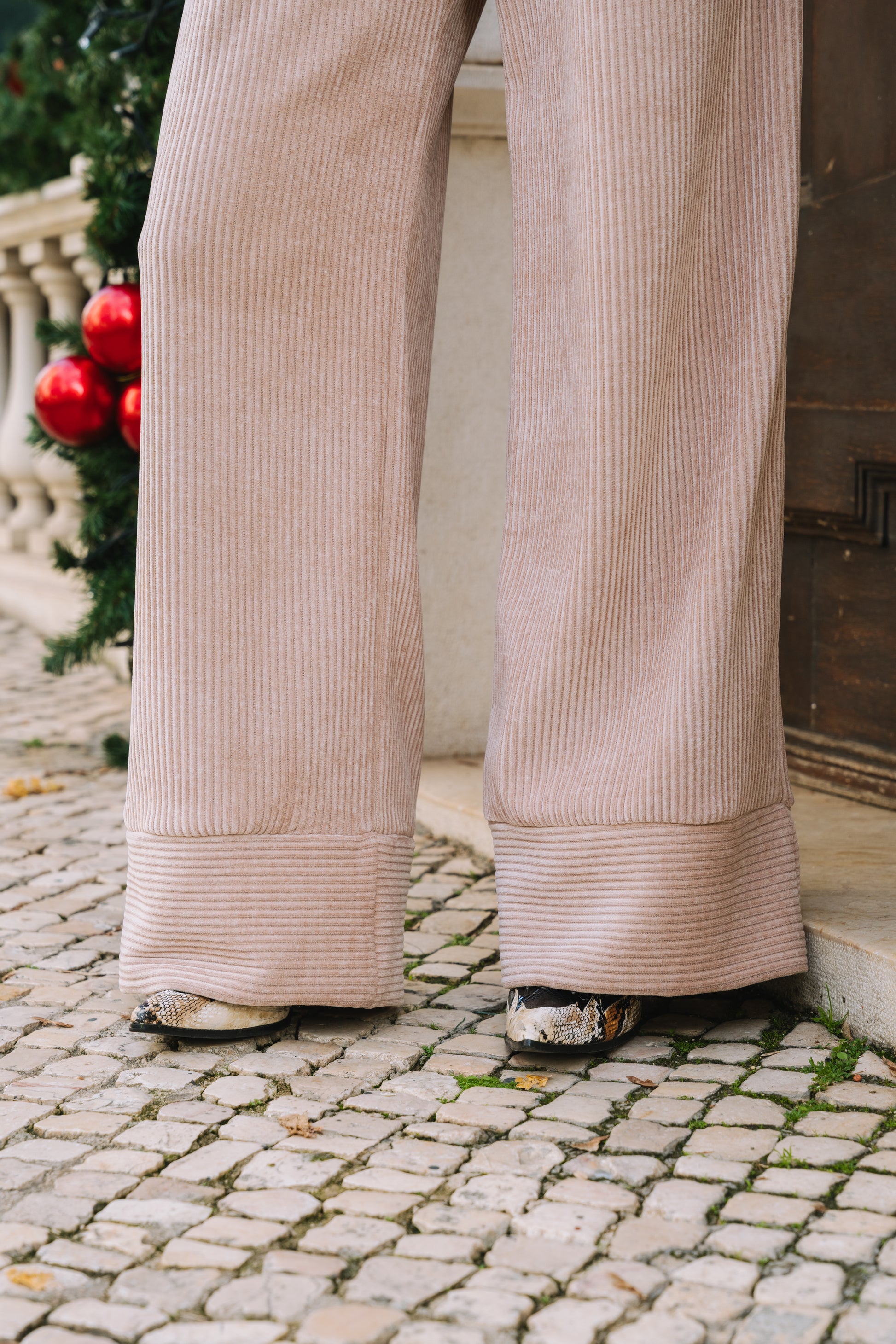 Calças pantalonas em malha com canelado largo, bege-areia.