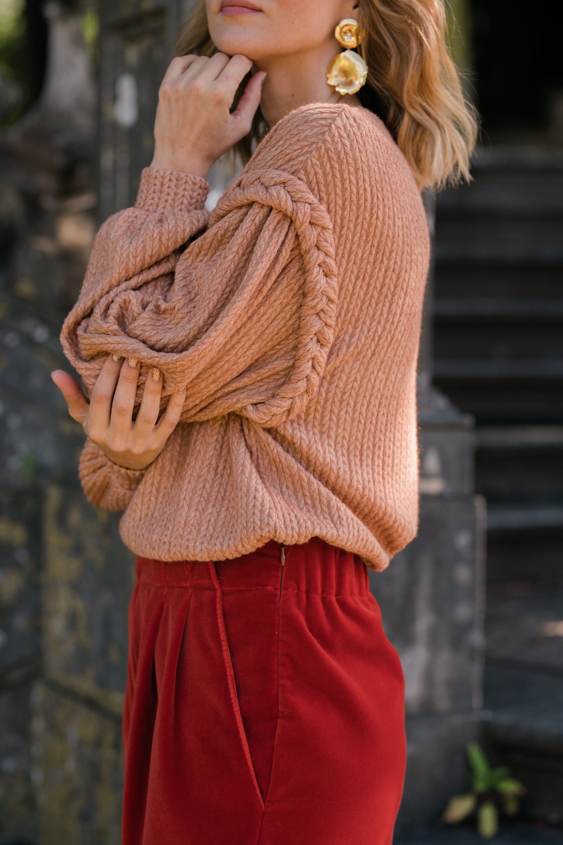 Calças pantalonas, de cinta subida, com pregas na frente e elástico no cós das calças, para melhor ajustar ao tamanho. Fecho lateral e bolsos.