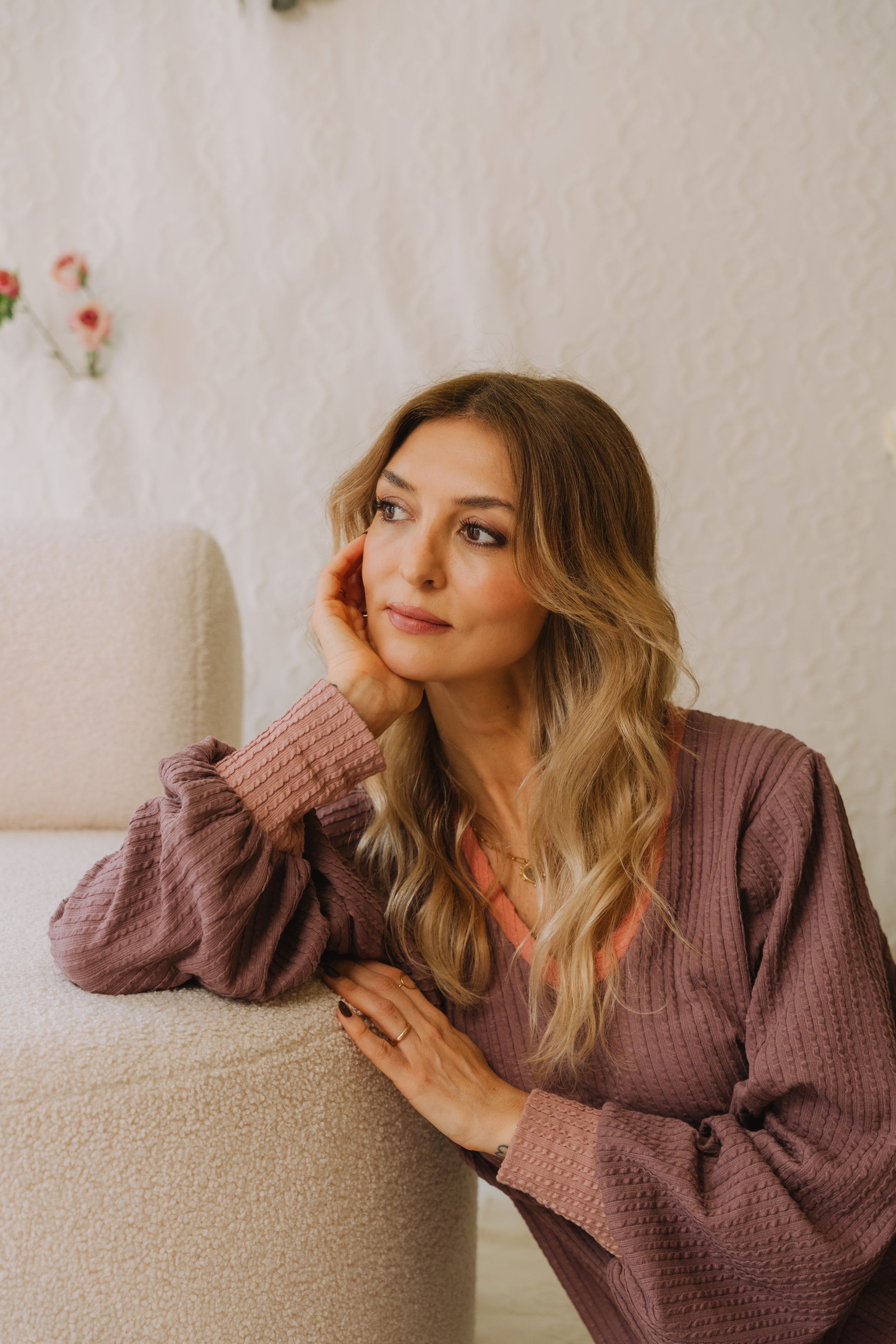Decote redondo em coral pastel. Manga ligeiramente franzida no ombro e bastante abalonada no punho. Punho alto em tom rosado.