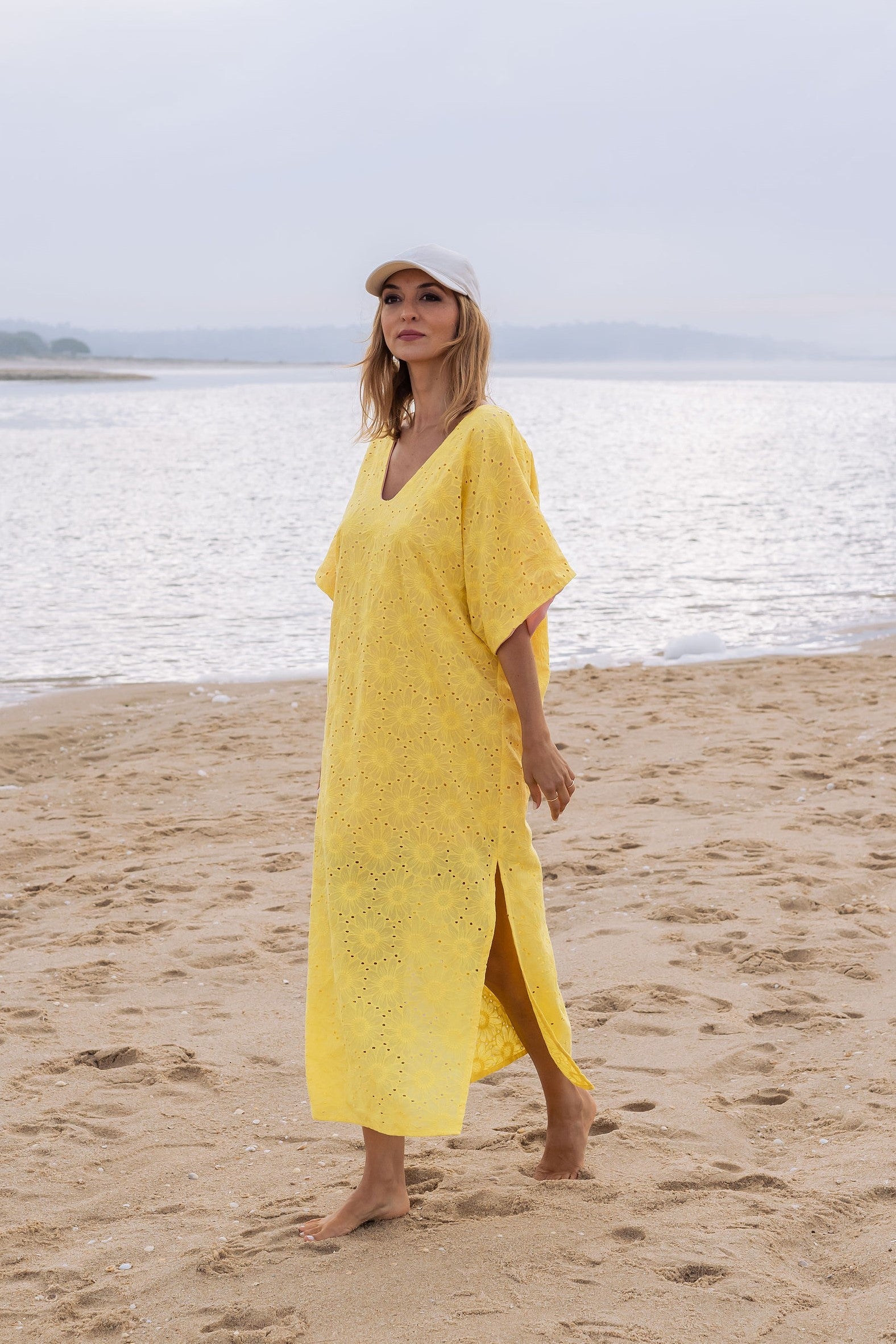 Vestido em estilo Kimono, em algodão bordado. Forro cor-de-rosa, que se mostra por entre o bordado, no interior das mangas e no cinto.