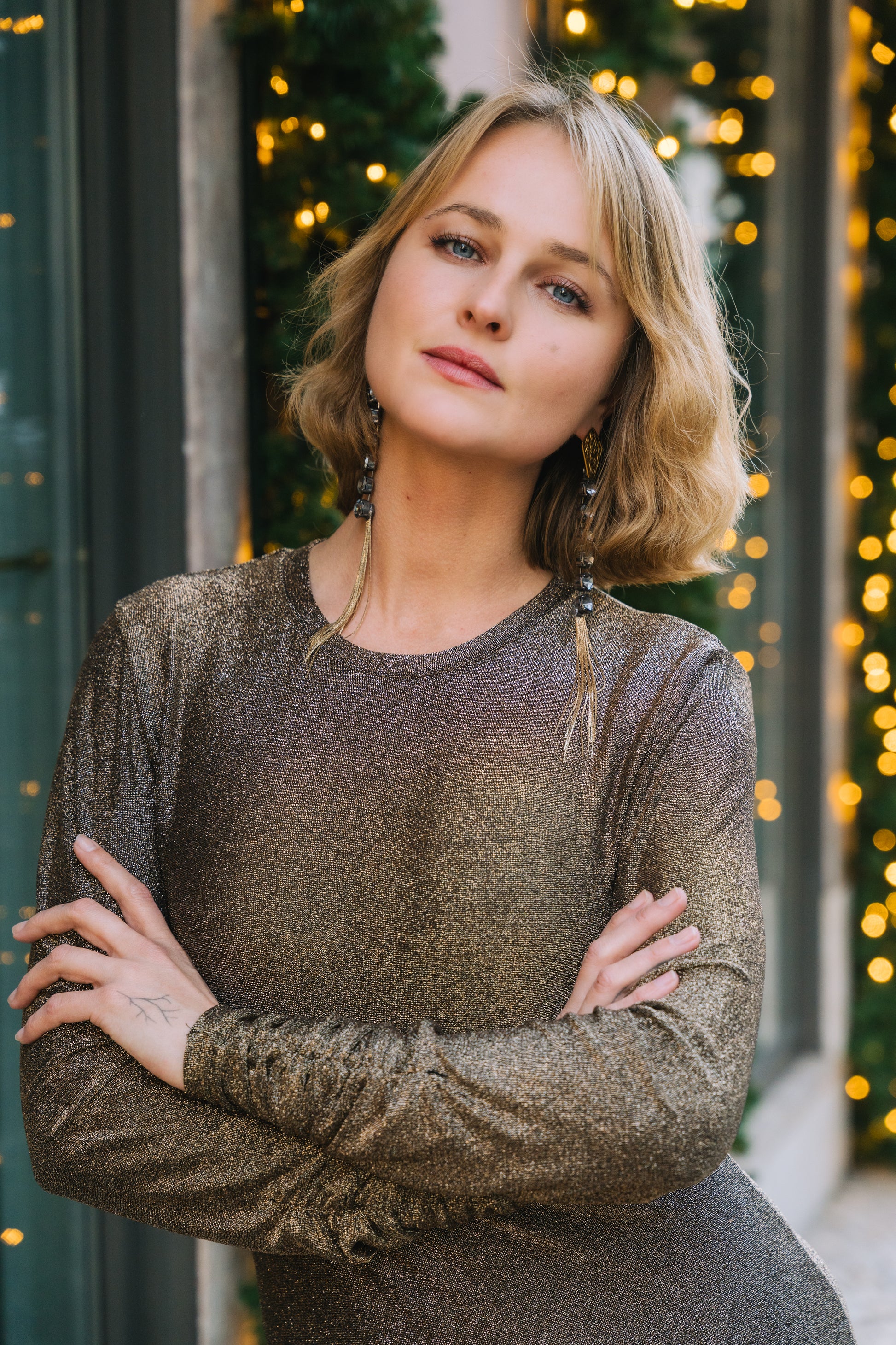 Vestido comprido em malha sparkly dourado velho . Manga com pormenor franzido no antebraço. Corte assimétrico abaixo da anca, com saia franzida e bainha rolinho com efeito ondulado.