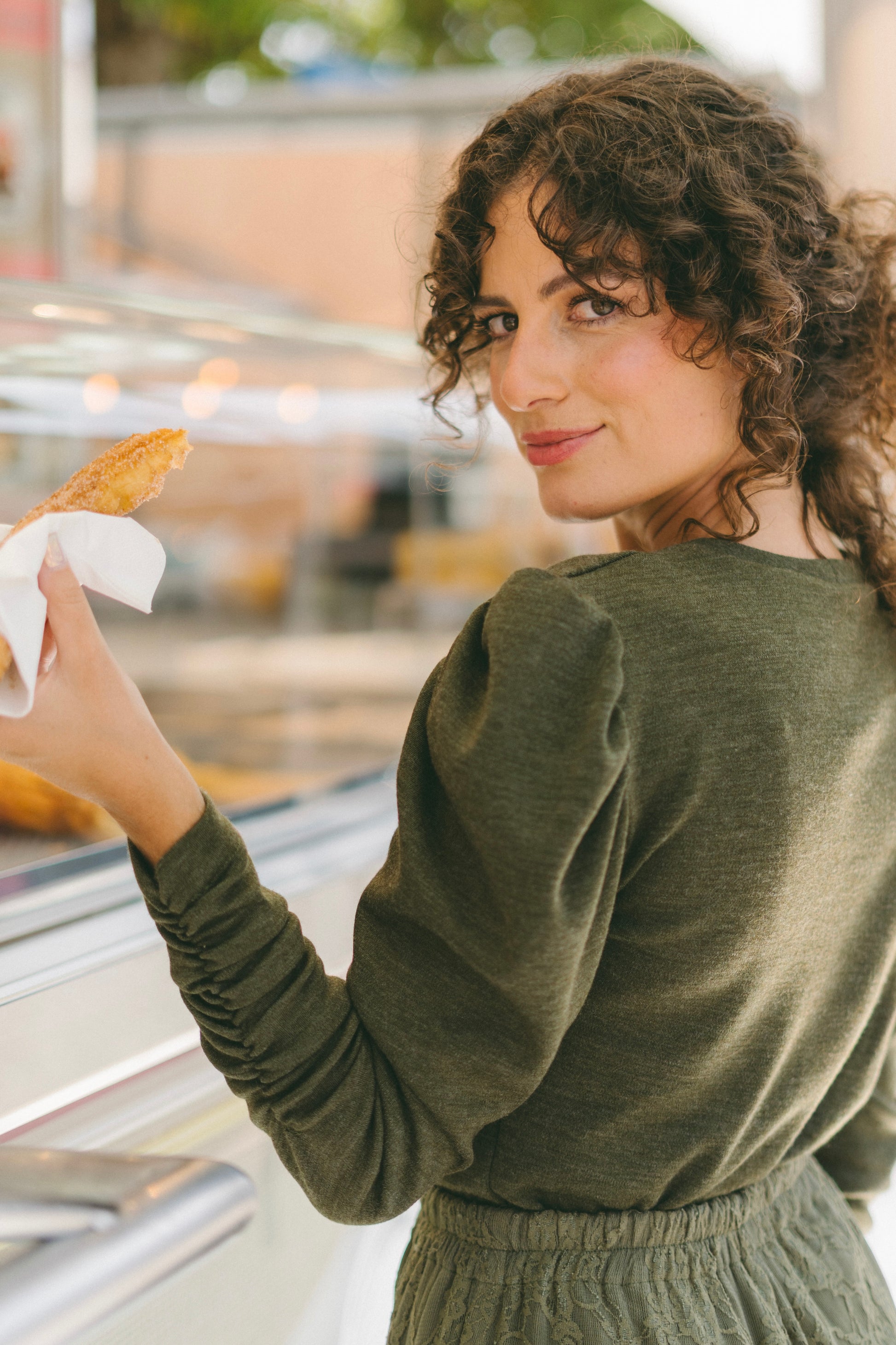 Efeito franzido no centro do peito e no antebraço.