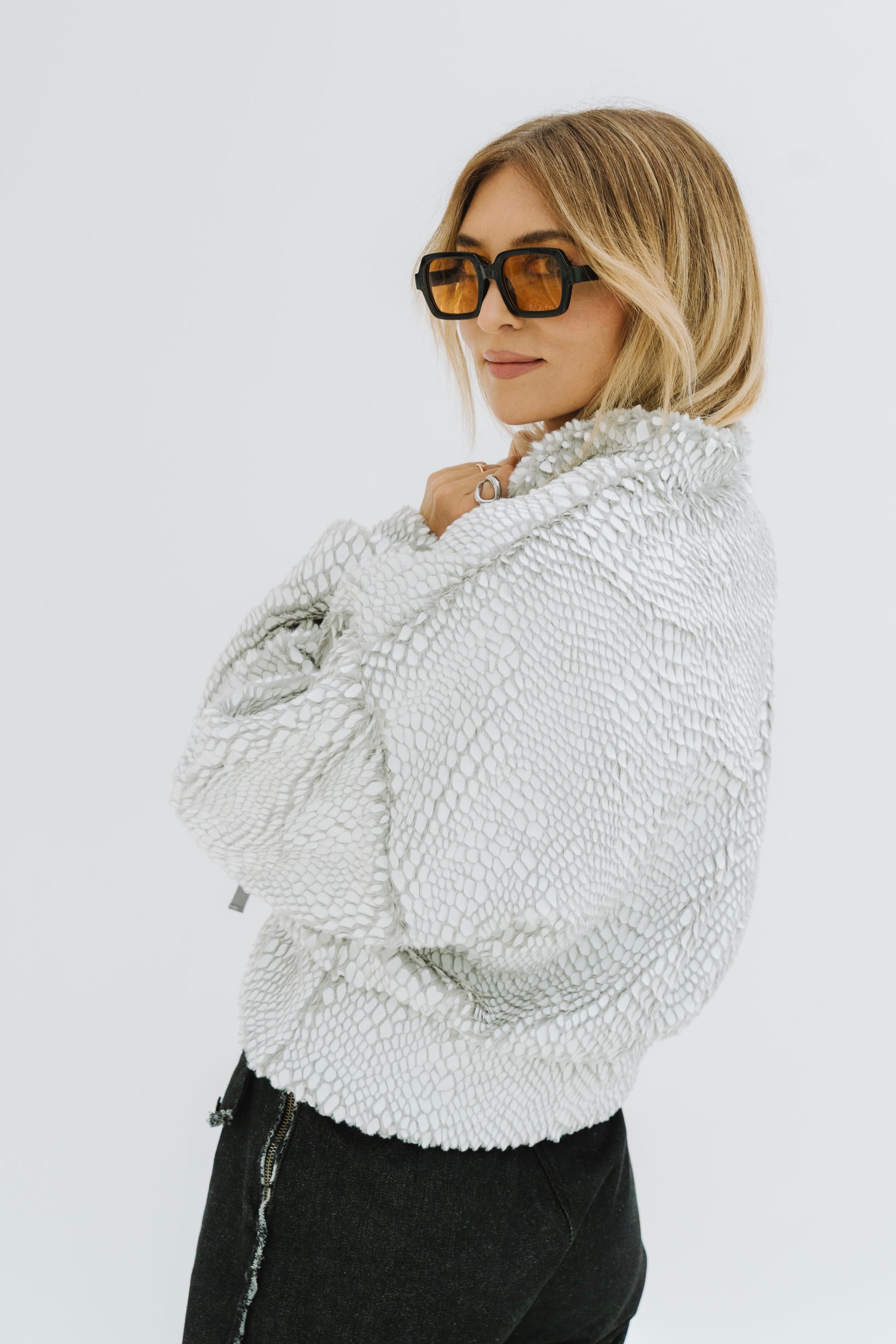 Bomber abalonado na cintura, em pelo cinza, que termina com efeito impermeável em branco, dando um efeito de escamas.