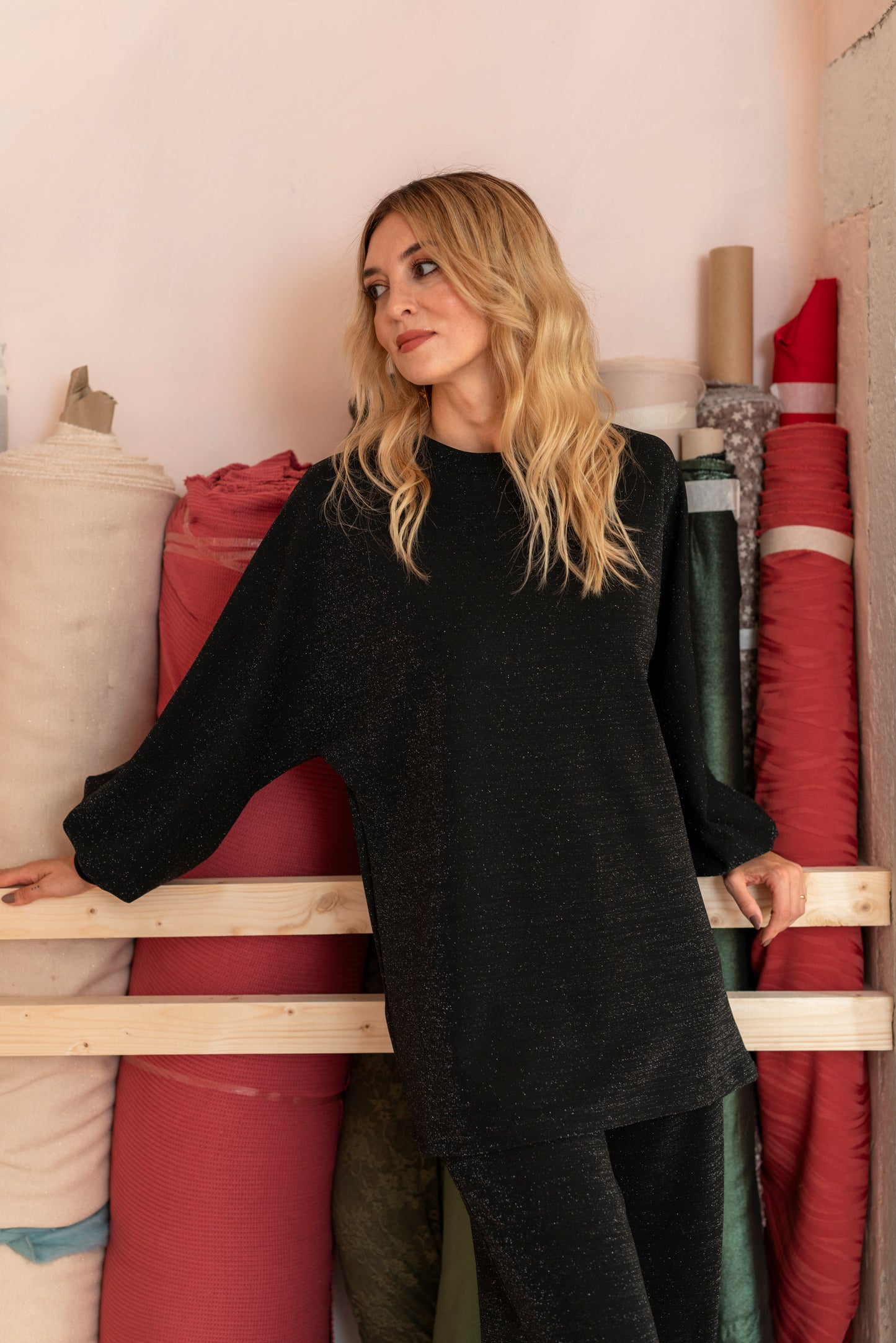 Sweater oversized em malha grossa, com apontamentos brilhantes. Manga morcego abalonada no punho. Fundo arredondado. Mais curta na frente e mais comprida nas costas.