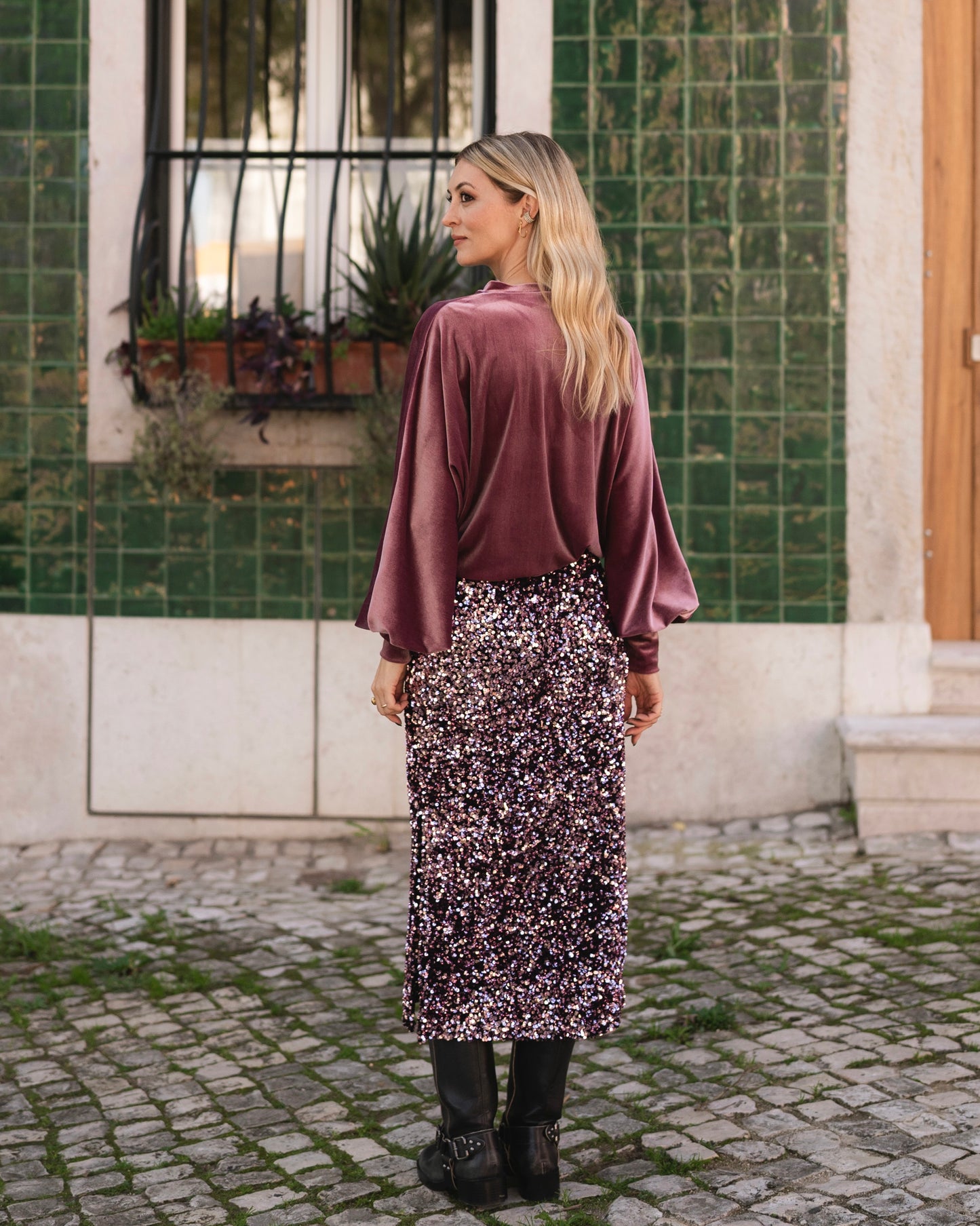 Base em veludo preto com elasticidade e lantejoulas rosa pálido dispersas irregularmente. Cintura subida, com elástico no cós, para melhor conforto e ajustar ao tamanho.