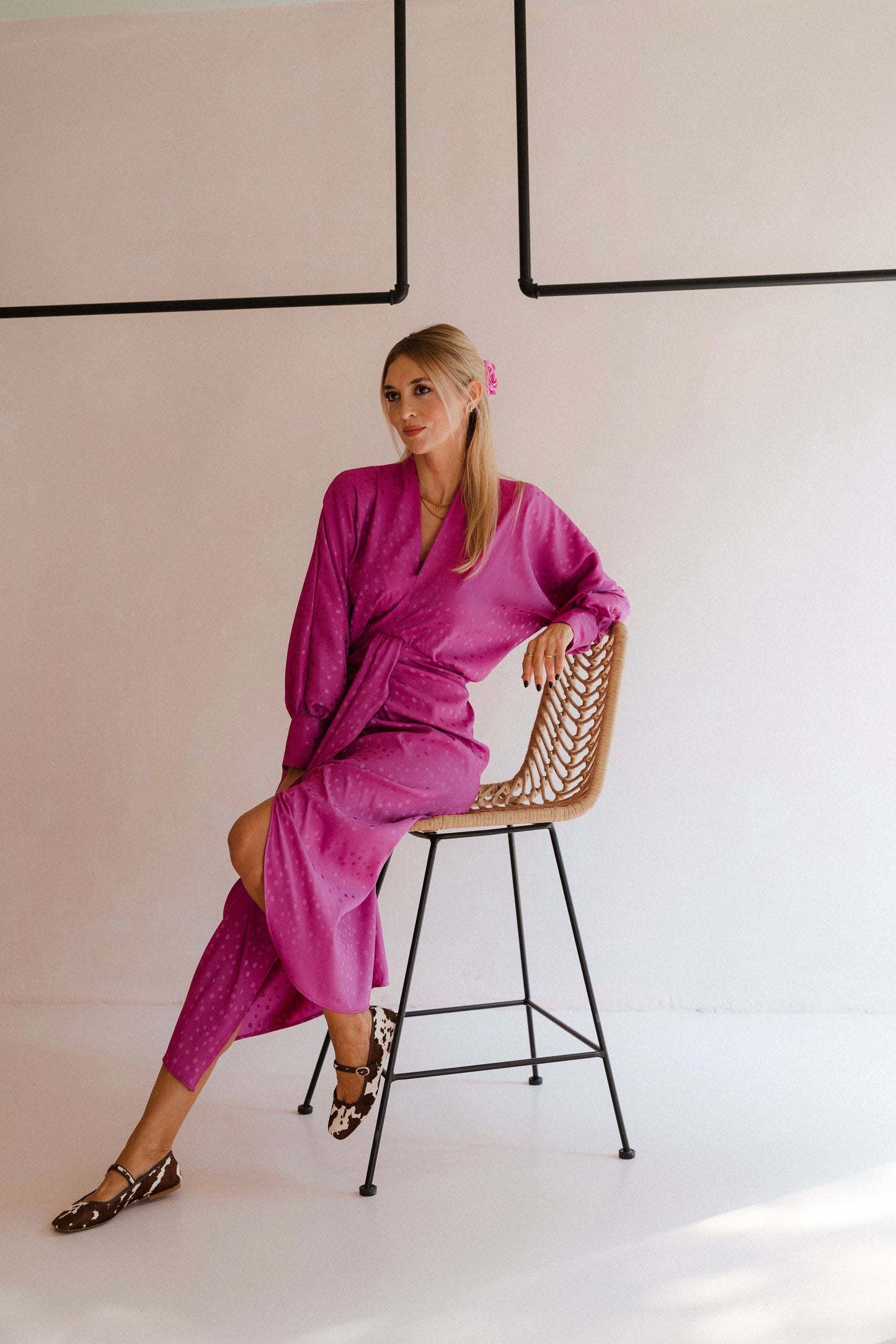 Vestido midi com manga-morcego franzida num punho alto. Parte superior ablusada, com decote em V, que se prolonga para uma meia-gola no decote-costas.