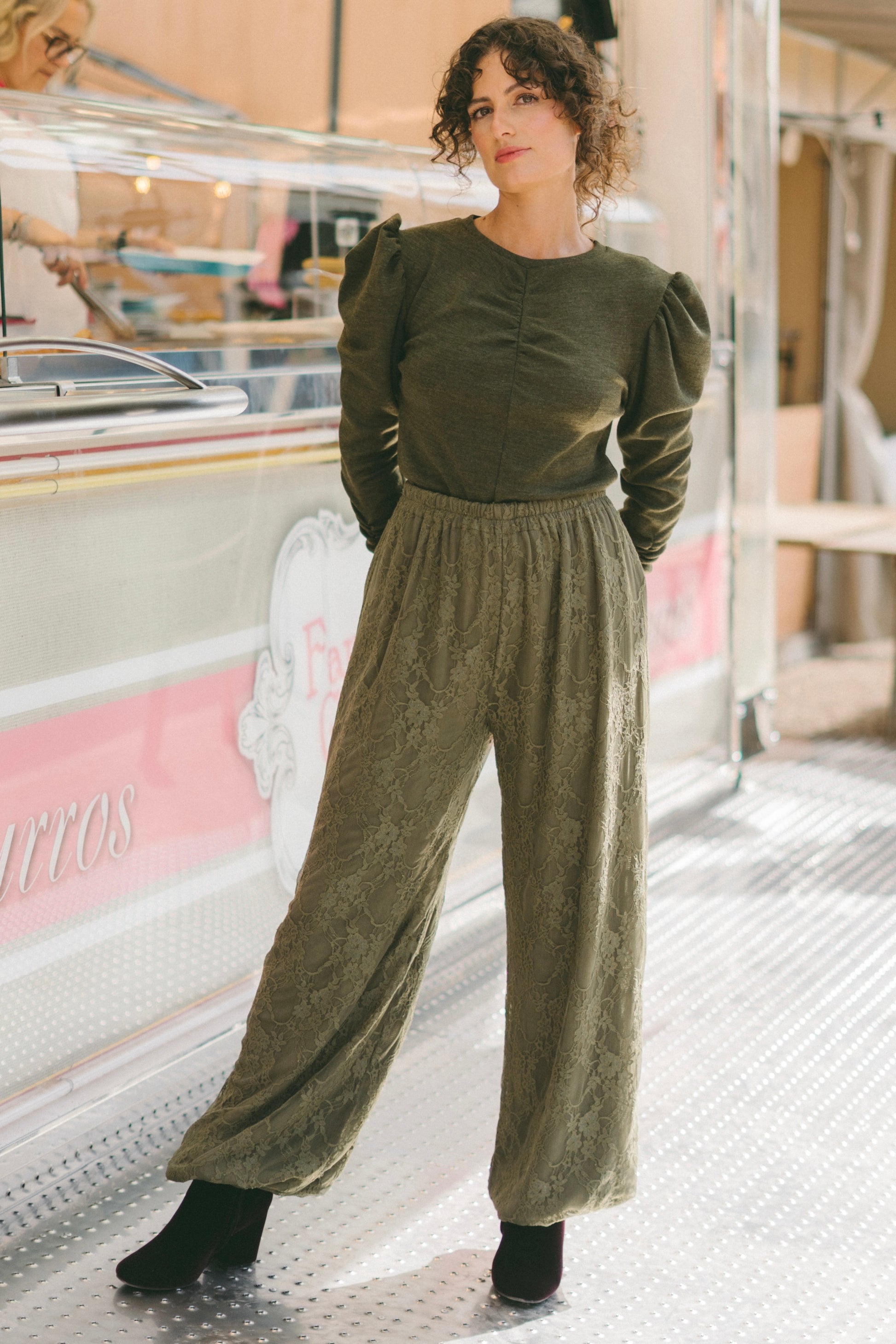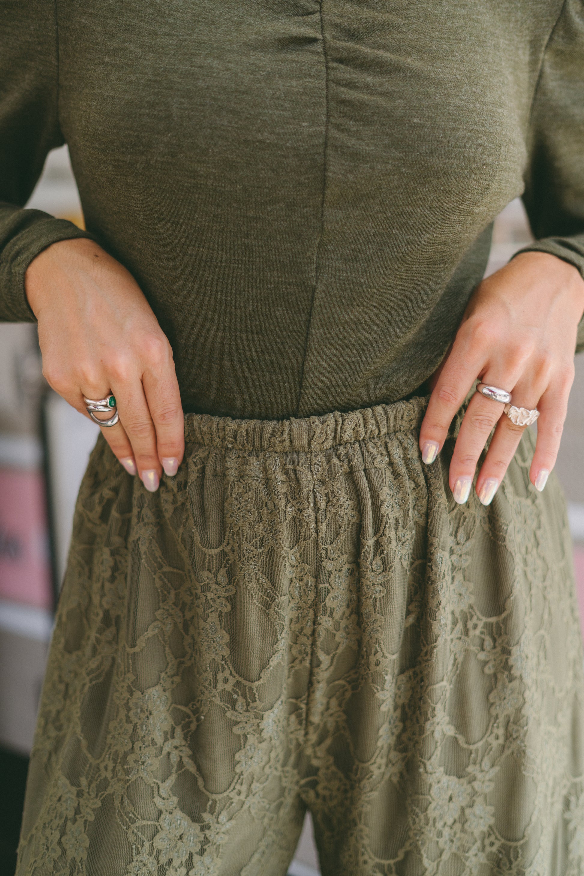 Calças com corte aladino em renda verde caqui, forradas na sua totalidade com tecido suave de linho e viscose.