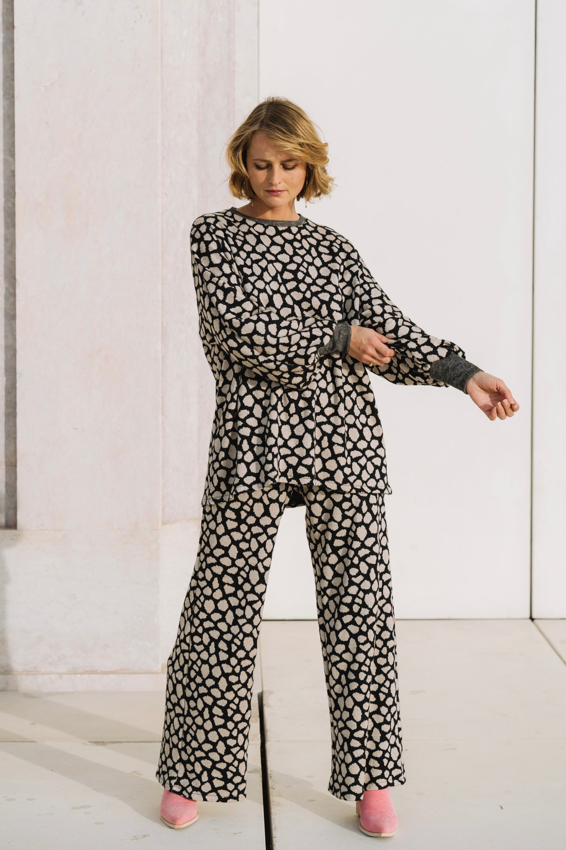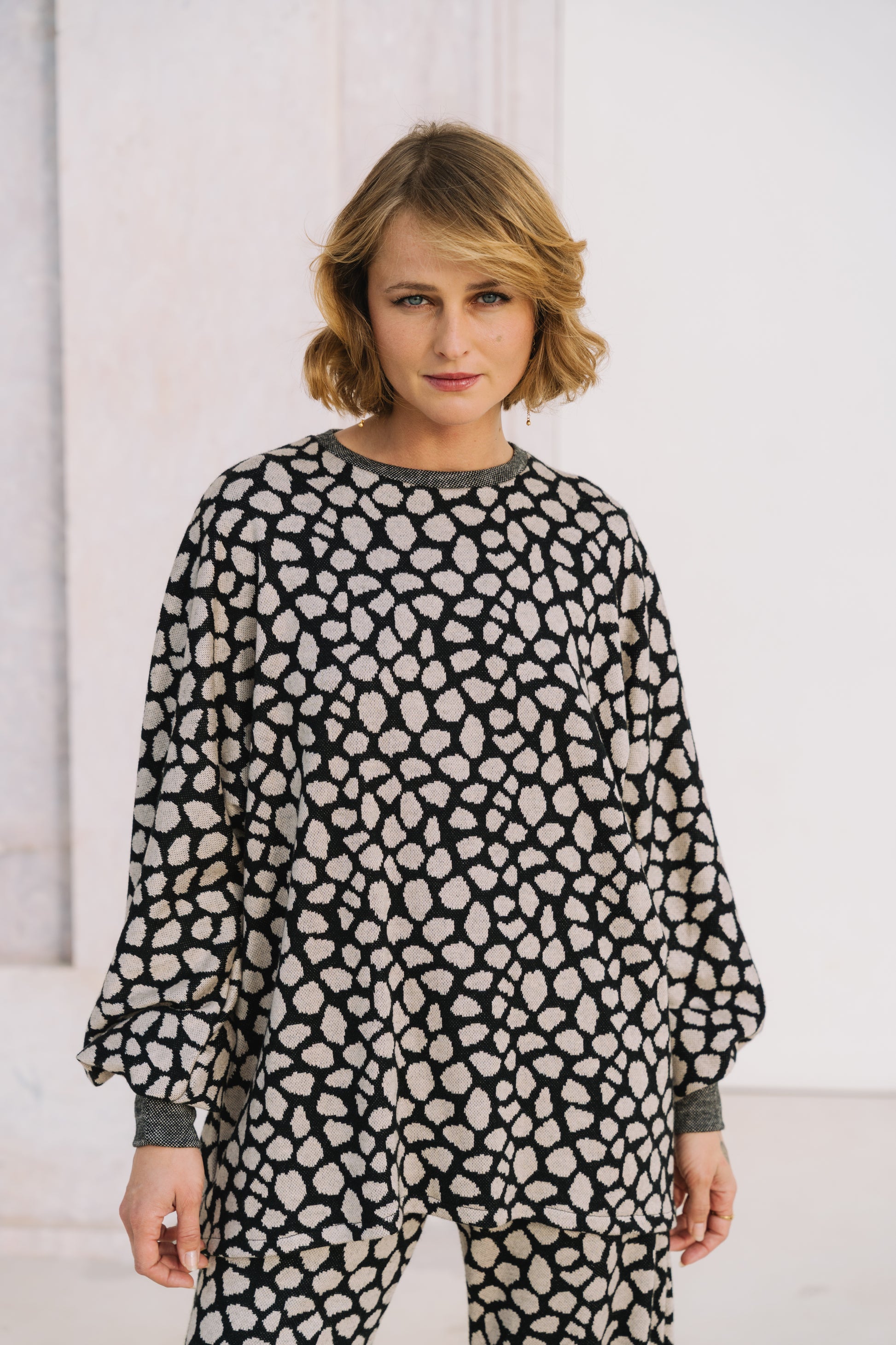 Camisolão em malha tricotada jacquard, em preto e bege.