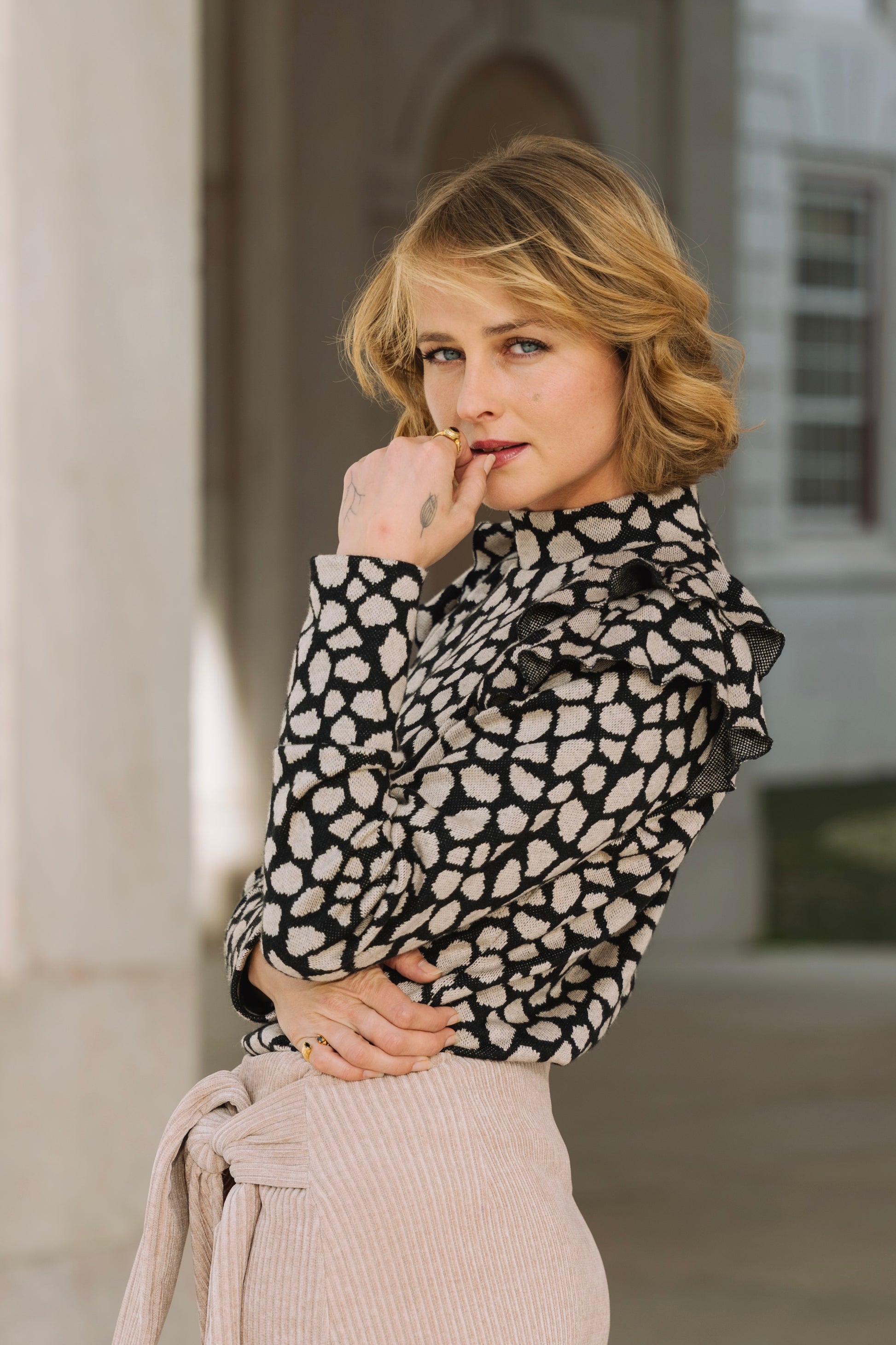 Meia gola e manga raglan, a partir de onde saem, na zona do ombro, duas camadas de folhos, dando-lhe um toque de dramatismo.